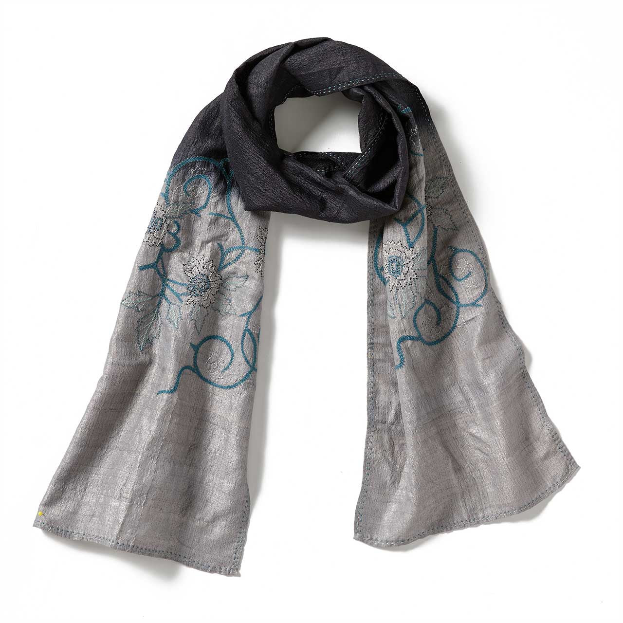 Accessorize with a beautiful fair trade scarf. Each scarf is made from 100% tussar silk, which is loomed by hand and boasts a rich texture and subtle metallic sheen. After dip-dyeing by hand to obtain the deep navy and powder blue colors, artisans embroider a delicate floral design on each sustainable scarf as a finishing touch. To clean, hand wash only. Dimensions: 66"l x 10"w