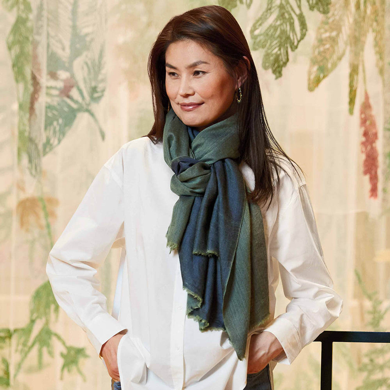Luxuriously soft! This reversible handmade scarf is made using a centuries-old craft of the Kashmir region and features soft, silky color, fit for royalty. Finished with a slight fringe. Hand wash cold, line dry. 85% Wool/15% Silk. Dimensions: 81"l x 28"w.