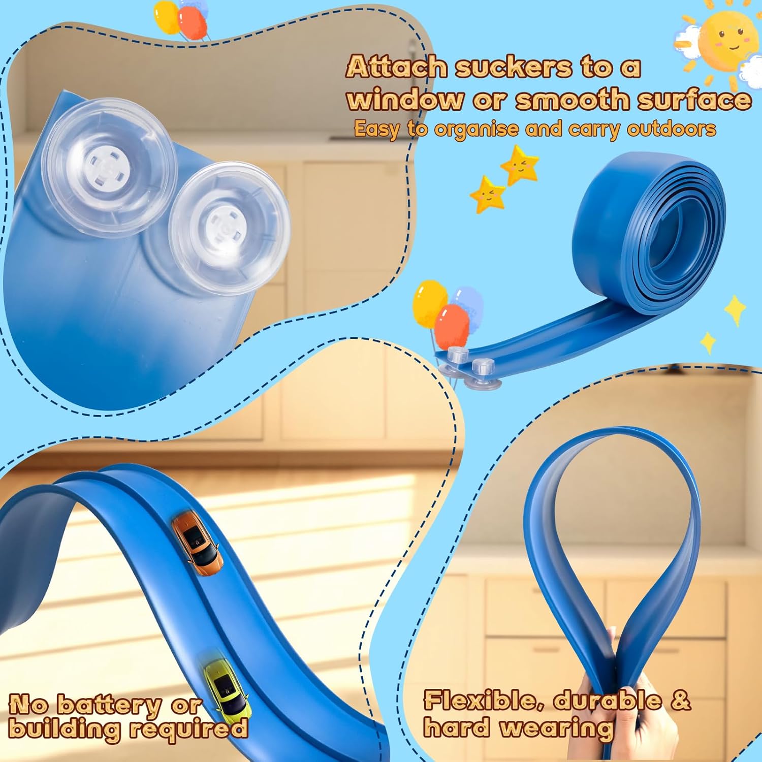 - 🌟 Flexible & Portable: 15-foot-long two-lane track made of flexible material allows custom layouts. Sets up or packs away in 30 seconds—easy storage & transport!